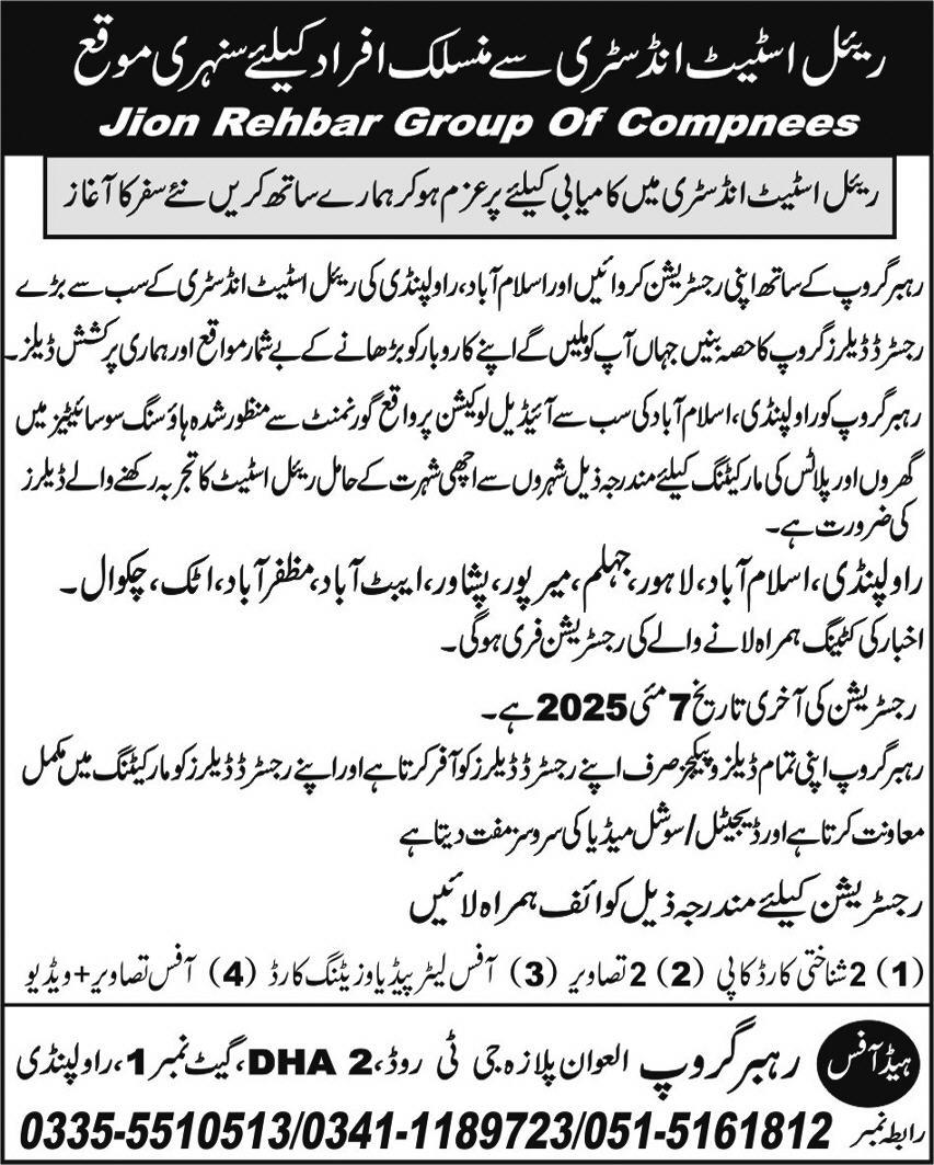 Vacant posts including dealer are announced in Jion Rehbar Group of Compnies Rawalpindi, rawalpindi Punjab Pakistan as per 17 April 2025 advertisement in daily Express Newspaper. Bachelor and Intermediate etc. educational qualification will be preferred.
