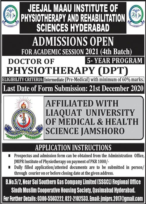 Jeejal Maau Institute Of Physiotherapy And Rehabilitation Sciences affiliated with Liaquat University of Medical & Health Science invites applications for admissions in Doctor of Physical Therapy DPT degree program. Read newspaper ad for exact details.