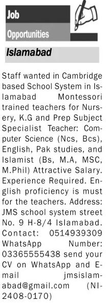 JMS School Islamabad, islamabad Islamabad Pakistan invites applications from eligible candidates for the post of english teacher, montessori trained teacher, kg teacher, nursery teacher, prep teacher, subject specialist, teacher, islamiat teacher, computer science teacher and pak studies teacher as per advertisement of August 29, 2024 published in daily The News Newspaper. Educational qualifications required BA, MA, Master, M.sc, Mphil, Bachelor and MS etc.