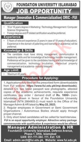 Foundation University Islamabad jobs advertisement dated about 1 May 2023 in daily The News Newspaper invites application for the vacant post of manager innovation commercialization in Islamabad, islamabad Islamabad Pakistan. Educational qualifications required Master, Bachelor and MS etc.