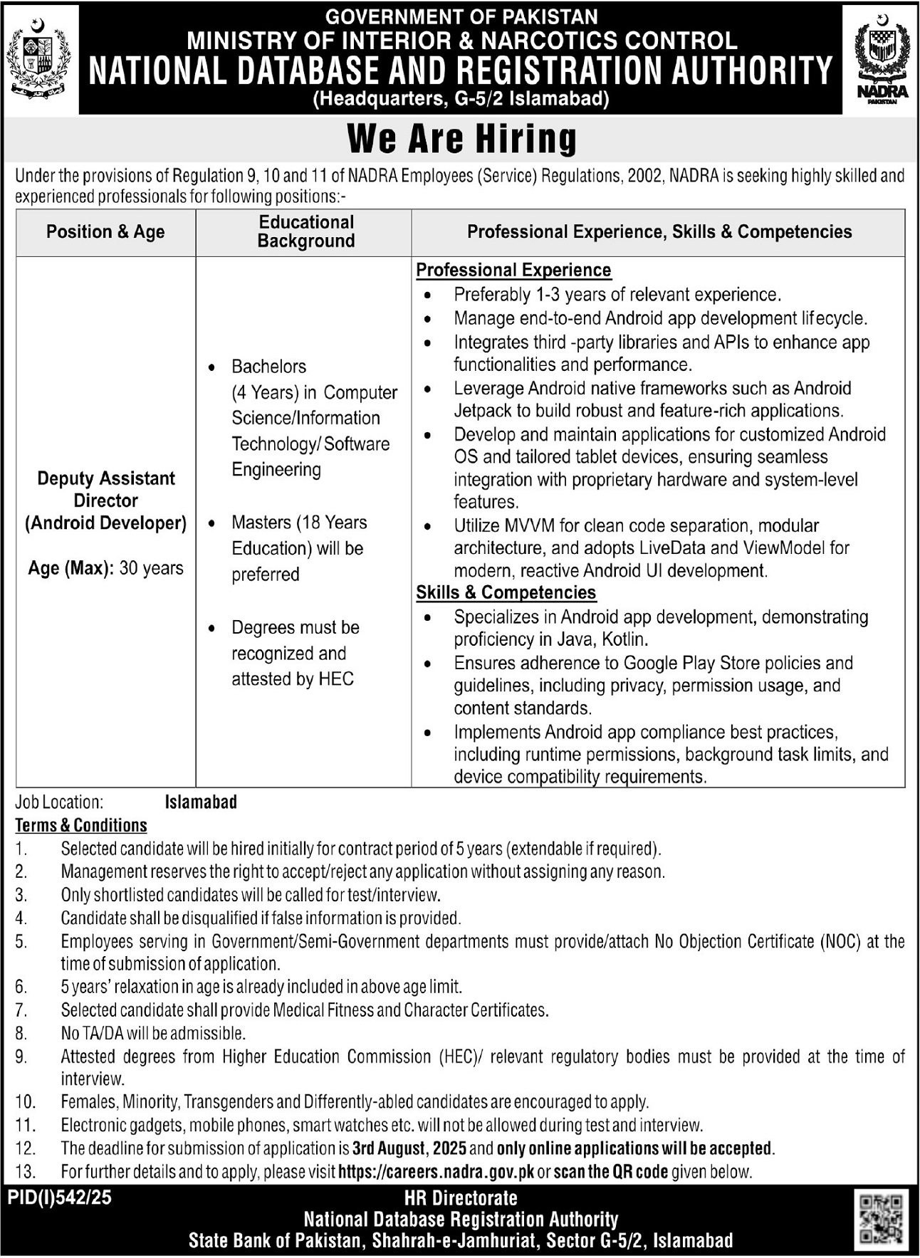 Apply at National Database & Registration Authority NADRA latest Government jobs in Management and departments before closing date which is around August 3, 2025 or as per closing date in newspaper ad. Read complete ad online to know how to apply on latest National Database & Registration Authority NADRA job opportunities.