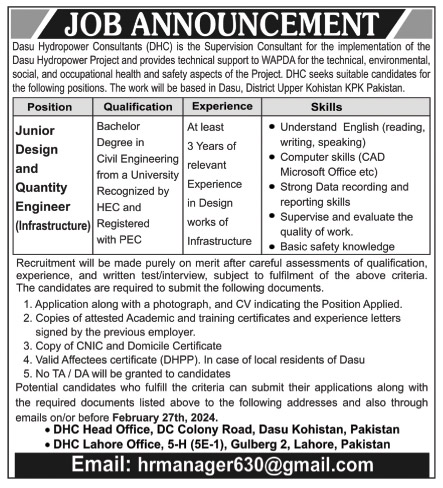 Dasu Hydropower Consultants Kohistan, kohistan Khyber Pakhtunkhwa KPK Pakistan invites applications from eligible candidates for the post of design quantity engineer infrastructure as per advertisement of February 14, 2024 published in daily Nation Newspaper. Candidates with B.E etc. educational background will be preferred.