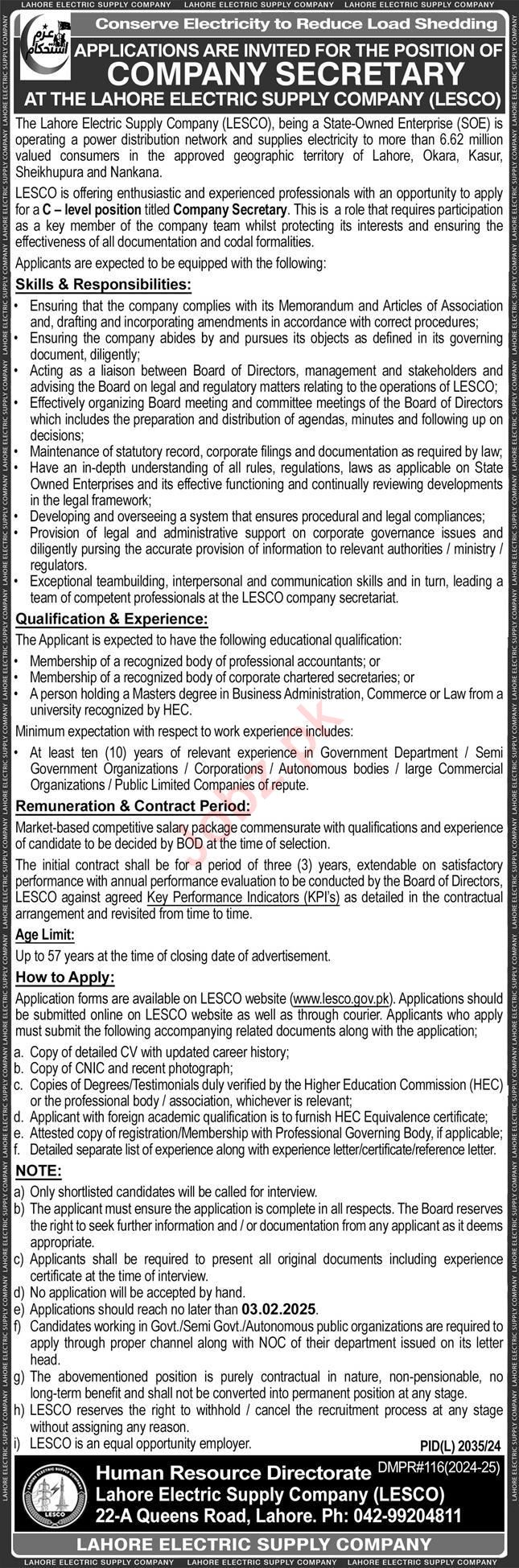 Lahore Electric Supply Company LESCO latest Government Secretarial jobs and others can be applied till February 3, 2025 or as per closing date in newspaper ad. Read complete ad online to know how to apply on latest Lahore Electric Supply Company LESCO job opportunities.