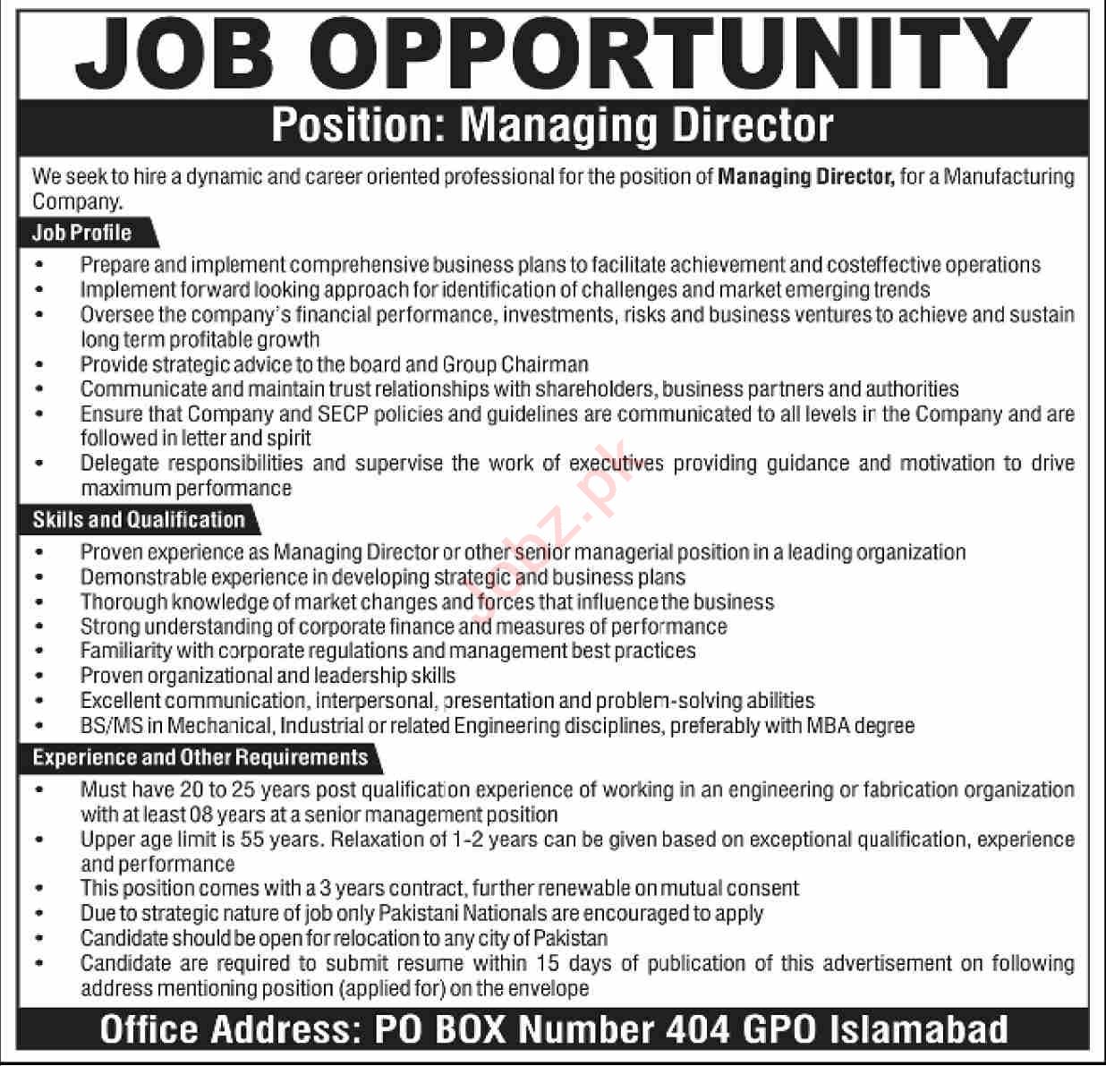 Manufacturing Company jobs advertisement dated about 22 September 2024 in daily Dawn Newspaper invites application for the vacant post of managing director in Islamabad, islamabad Islamabad Pakistan. Master and Bachelor etc. educational qualification will be preferred.