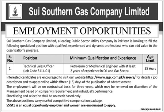 Vacant posts including technical sales officer are announced in Sui Southern Gas Company Limited SSGC Karachi, karachi Sindh Pakistan as per 22 May 2022 advertisement in daily Jang Newspaper. Persons with B.E and Others etc. education can apply.