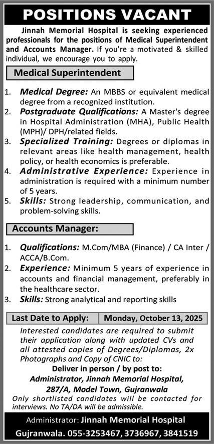 Jinnah Memorial Hospital Model Town Gujranwala, gujranwala Punjab Pakistan invites applications from eligible candidates for the post of medical superindendent and accounts managr as per advertisement of September 26, 2025 published in daily Express Newspaper. ACCA, MBBS, MBA, Master, B.com, CA and Intermediate etc. educational qualification will be preferred.
