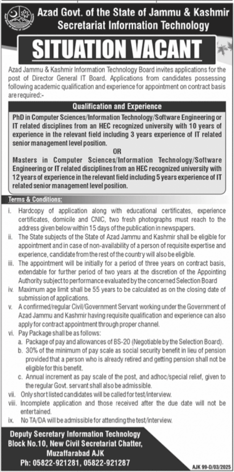 Vacancies in Azad Jammu & Kashmir Information Technology AJK IT Board Advertisement March 2025