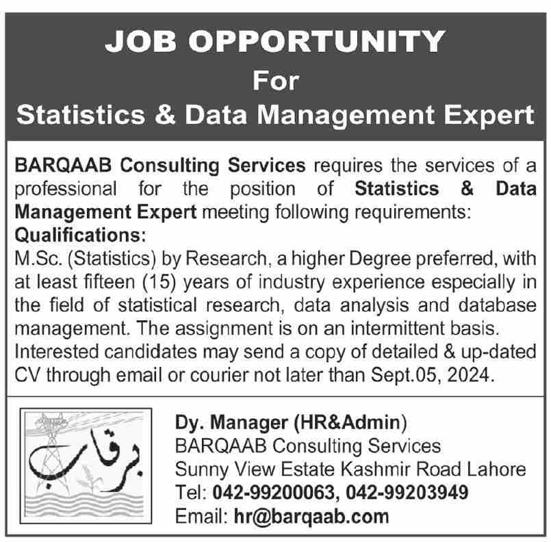Barqaab Consulting Services Pvt Limited jobs advertisement dated about 31 August 2024 in daily Dawn Newspaper invites application for the vacant post of statistics data management expert in Lahore, lahore Punjab Pakistan. Preferred Education is M.sc etc.