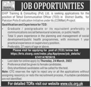 Vacant posts including tehsil communication officer tco are announced in CHIP Training & Consulting Pvt Ltd Quetta, quetta Balochistan Pakistan as per 17 March 2022 advertisement in daily Jang Newspaper. Candidates with Bachelor and Master etc. educational background will be preferred.