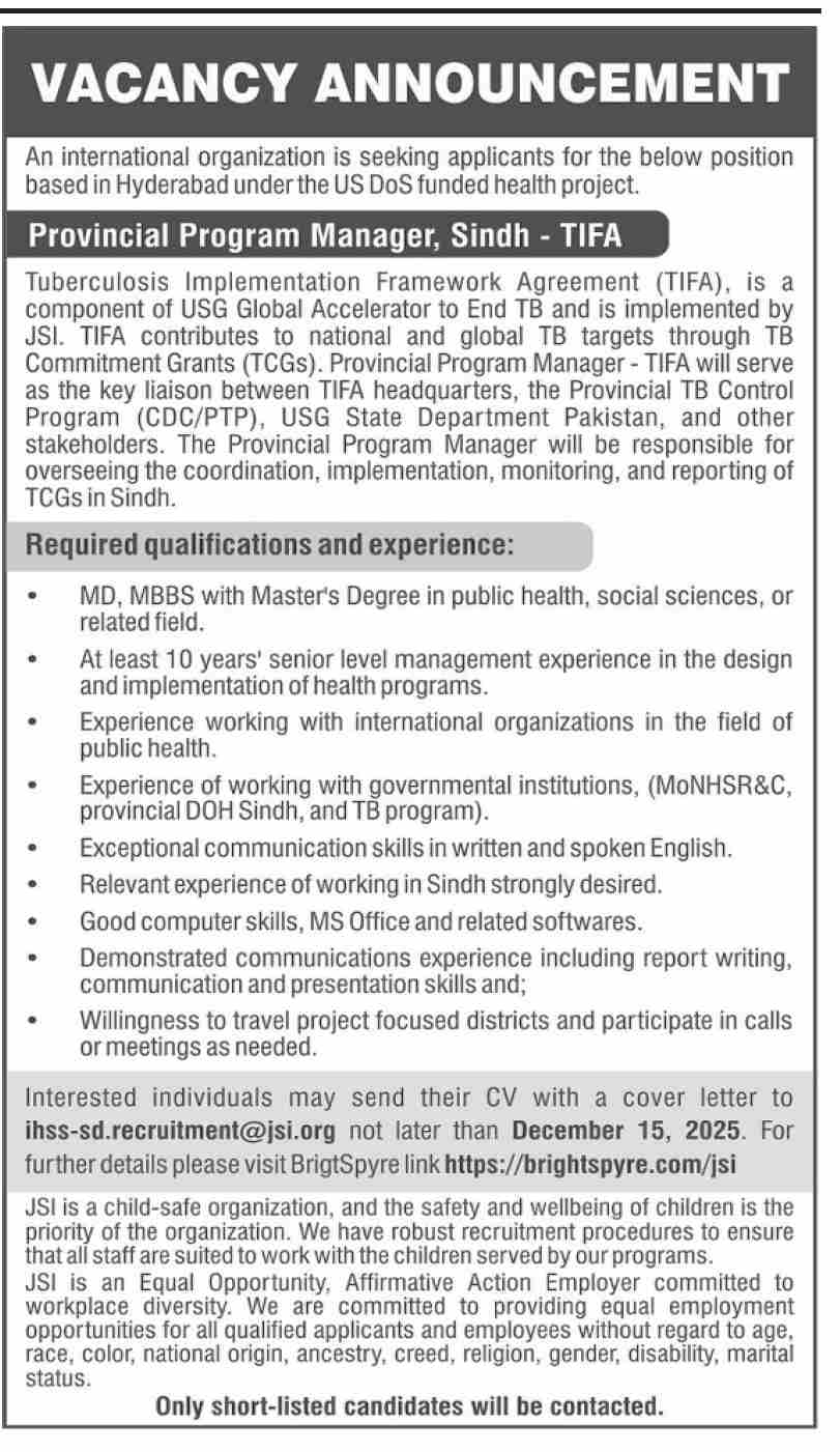 International Organization Hyderabad, hyderabad Sindh Pakistan invites applications from eligible candidates for the post of provincial program manager as per advertisement of December 7, 2025 published in daily Dawn Newspaper. Candidates with Master and MBBS etc. educational background will be preferred.