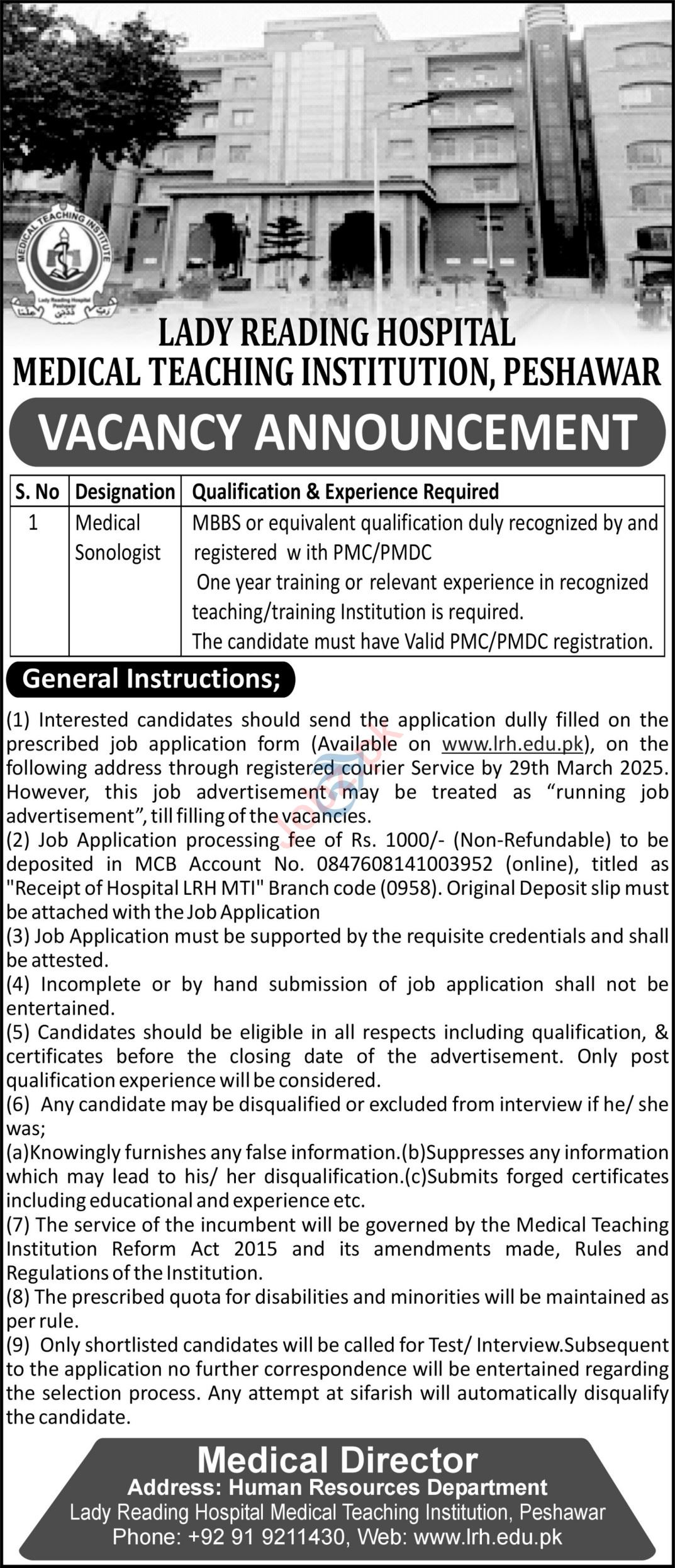 Lady Reading Hospital latest Government Medical jobs and others can be applied till 29 March 2025 or as per closing date in newspaper ad. Read complete ad online to know how to apply on latest Lady Reading Hospital job opportunities.