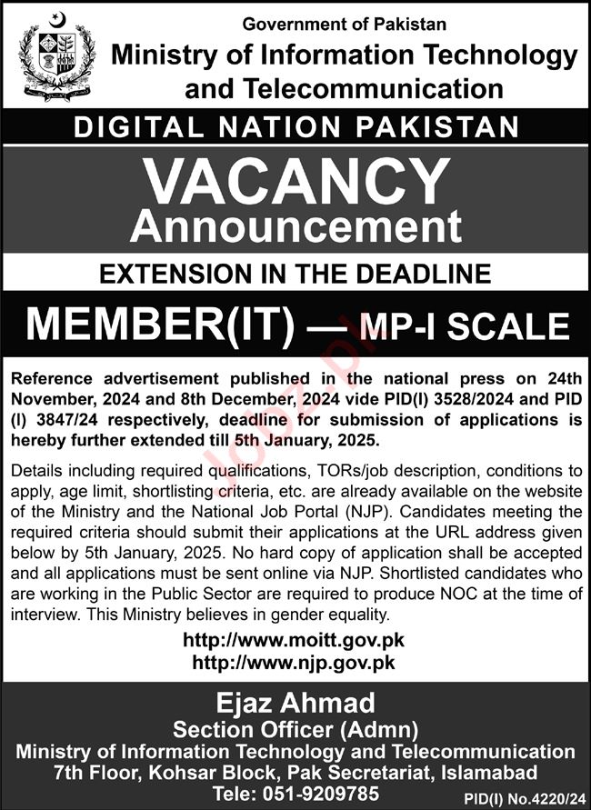 Vacant posts including member it are announced in Ministry of Information Technology & Telecommunication MOIT Islamabad, islamabad Islamabad Pakistan as per 23 December 2024 advertisement in daily Nation Newspaper. Educational qualifications required Bachelor and Master etc.
