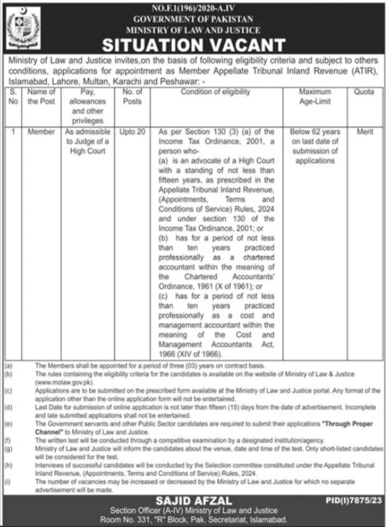 Ministry of Law and Justice jobs advertisement dated about 21 June 2024 in daily Jang Newspaper invites application for the vacant post of member in Islamabad, islamabad Islamabad Pakistan. Preferred Education is Master and Bachelor etc.