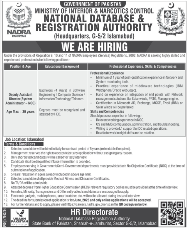 Vacant posts including deputy assistant director are announced in National Database & Registration Authority NADRA G-5 Islamabad, islamabad Islamabad Pakistan as per 18 May 2025 advertisement in daily Express Tribune Newspaper. Preferred Education is Bachelor and Master etc.
