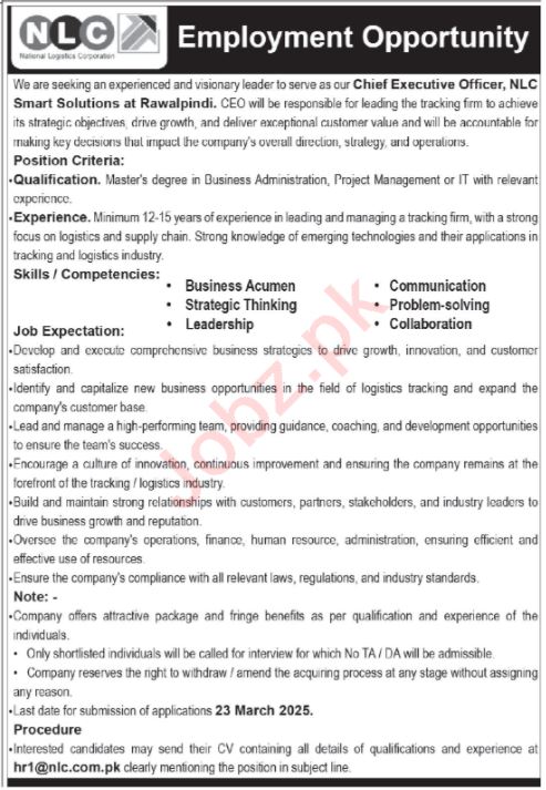 National Logistics Corporation NLC invites applications for job positions advertised in daily Express Tribune dated 9 March 2025 for following vacancies in G.H.Q Rawalpindi, rawalpindi Punjab Pakistan.