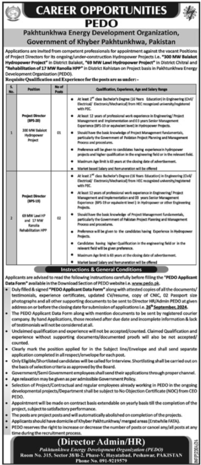 Pakhtunkhwa Energy Development Organization PEDO jobs advertisement dated about 6 September 2024 in daily Mashriq Newspaper invites application for the vacant post of project director in Peshawar, peshawar Khyber Pakhtunkhwa KPK Pakistan. Bachelor and Master etc. educational qualification will be preferred.