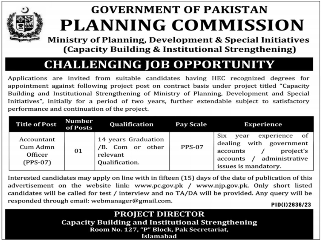 Ministry of Planning Development and Special Initiative Islamabad, islamabad Islamabad Pakistan invites applications from eligible candidates for the post of accountant cum admin officer as per advertisement of November 3, 2023 published in daily Express Tribune Newspaper. Persons with Bachelor and B.com etc. education can apply.