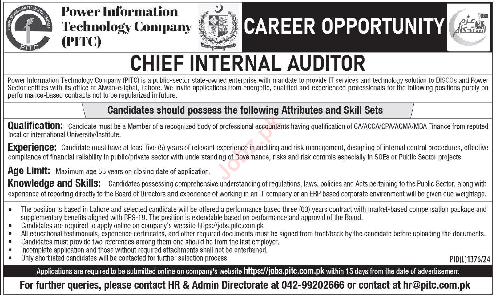 Power Information Technology Company PITC Lahore, lahore Punjab Pakistan invites applications from eligible candidates for the post of chief internal auditor as per advertisement of November 18, 2024 published in daily Express Tribune Newspaper. Persons with ACCA and CA etc. education can apply.