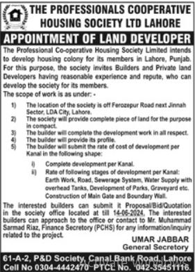 Vacancies in The Professionals Cooperative Housing Society Limited Advertisement June 2024