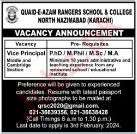 Quaid e Azam Rangers School & College invites applications for job positions advertised in daily Jang dated 28 January 2024 for following vacancies in Karachi, karachi Sindh Pakistan.