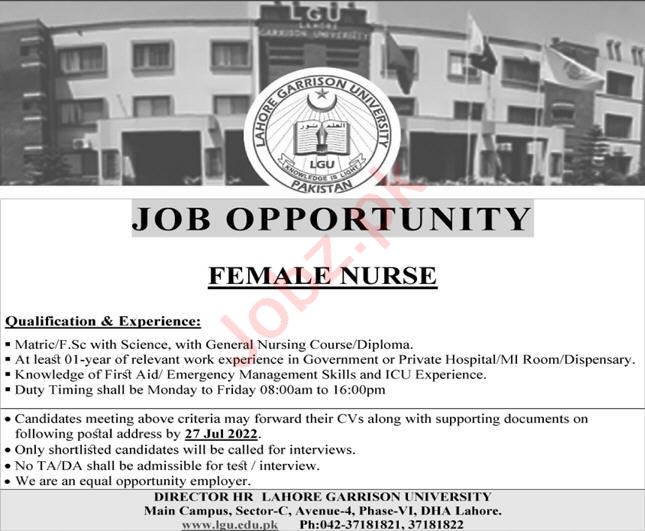 Vacant posts including female nurse are announced in Lahore Garrison University Lahore, lahore Punjab Pakistan as per 24 July 2022 advertisement in daily Express Newspaper. Educational qualifications required Intermediate and Matric etc.