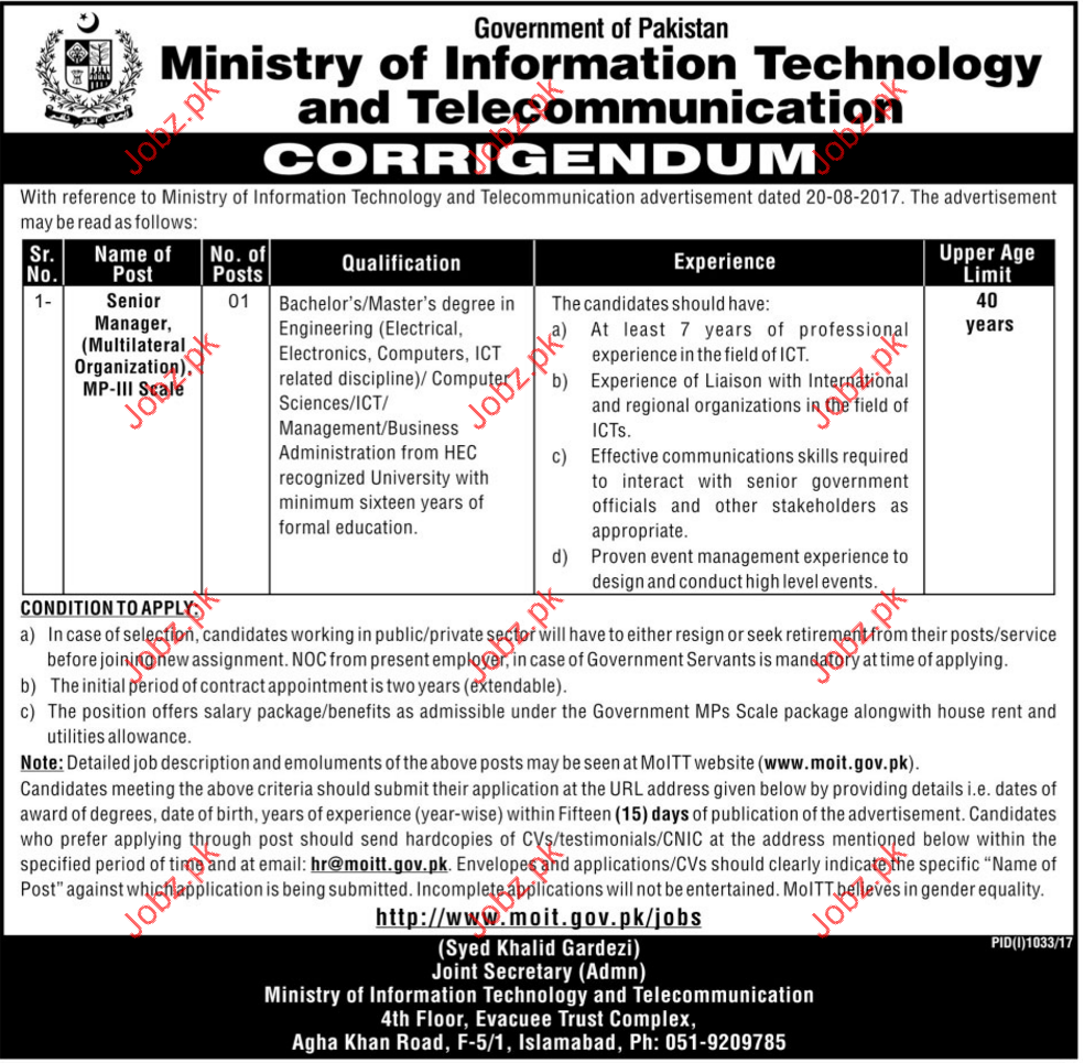 Job In Ministry Of Information Technology &Telecom Islamabad