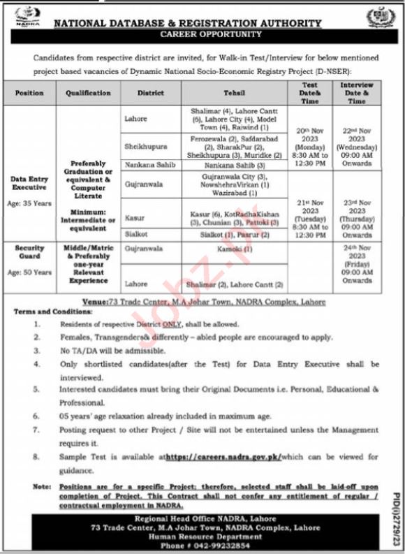 National Database & Registration Authority NADRA Lahore, lahore Punjab Pakistan invites applications from eligible candidates for the post of security guard and data entry executive as per advertisement of November 5, 2023 published in daily Nawaiwaqt Newspaper. MS, B.com, Bachelor, Matric, M.com, BIT and Intermediate etc. educational qualification will be preferred.