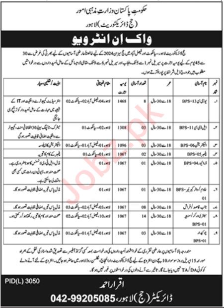 Vacant posts including naib qasid, electrician, ldc, sweeper, chowkidar, farash, udc, plumber, khadim, driver, sanitary worker and water carrier are announced in Ministry of Religious Affairs MORA Lahore, lahore Punjab Pakistan as per 31 March 2024 advertisement in daily Dunya Newspaper. Intermediate, Middle and Matric etc. educational qualification will be preferred.
