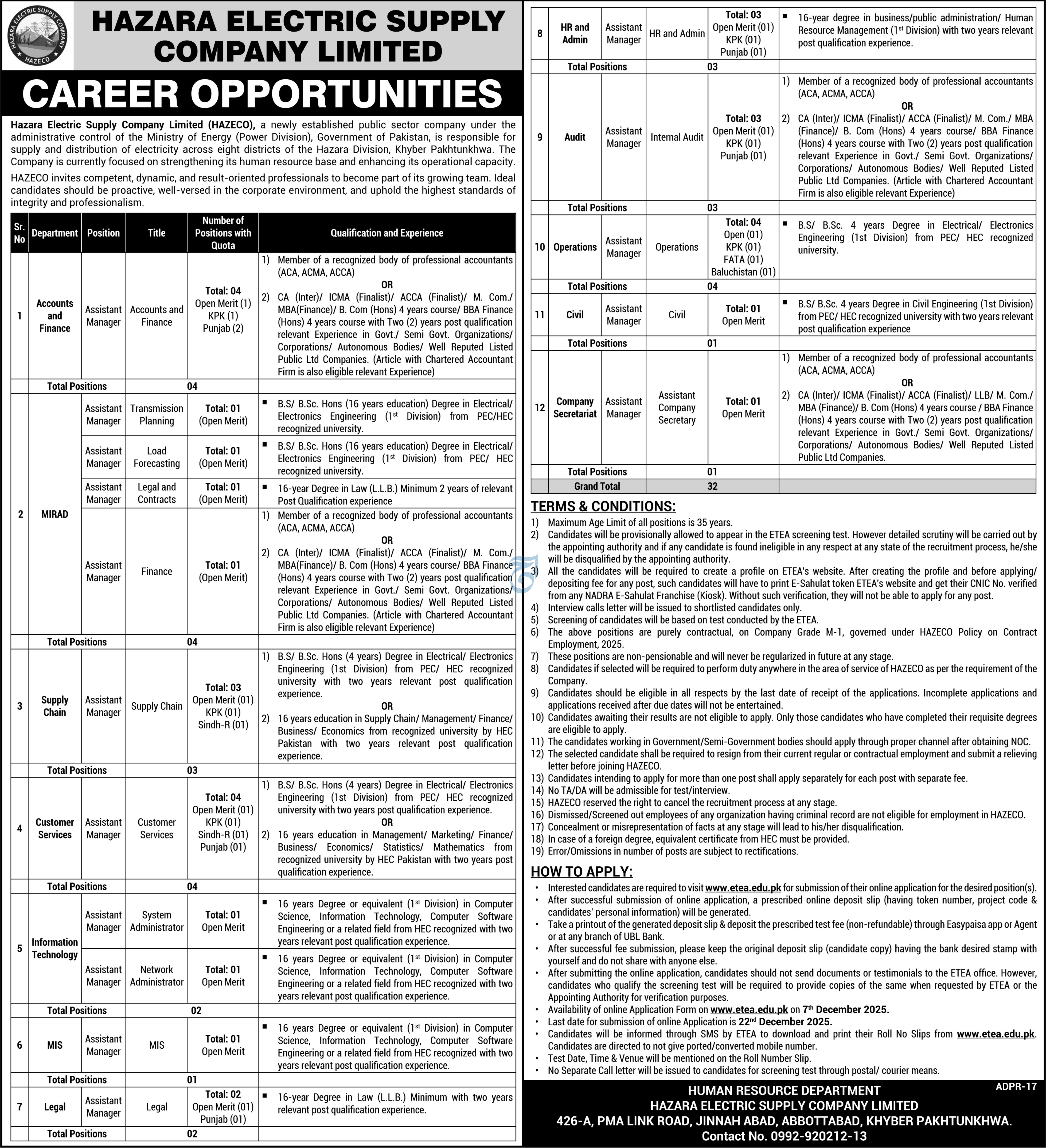 Vacancies in Hazara Electric Supply Company HAZECO Advertisement December 2025