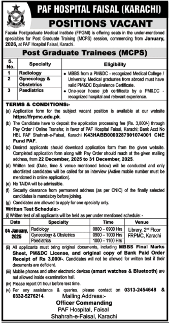 PAF Hospital latest Government Medical jobs and others can be applied till 31 December 2025 or as per closing date in newspaper ad. Read complete ad online to know how to apply on latest PAF Hospital job opportunities.