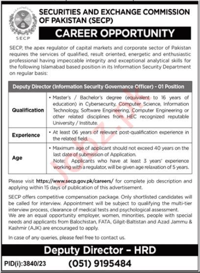 Securities & Exchange Commission of Pakistan SECP Islamabad, islamabad Islamabad Pakistan invites applications from eligible candidates for the post of deputy director information security as per advertisement of December 24, 2023 published in daily Jang Newspaper. Preferred Education is Master, MS and Bachelor etc.