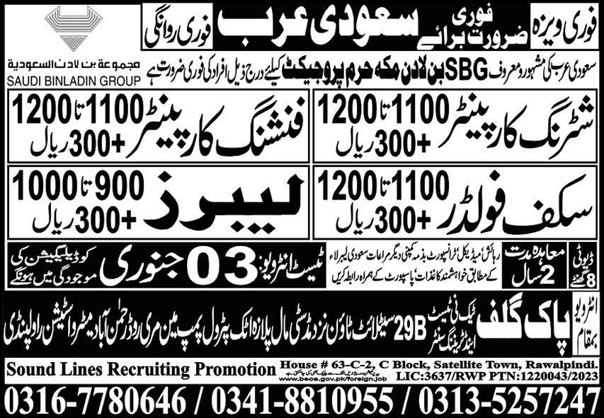 Sound Lines Recruiting Promotion latest Overseas Industrial jobs and others can be applied till January 3, 2024 or as per closing date in newspaper ad. Read complete ad online to know how to apply on latest Sound Lines Recruiting Promotion job opportunities. Employer provides accommodation, medical and transport facility.