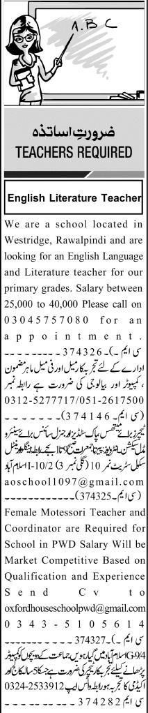 Vacant posts including computer teacher, montessori teacher, biology teacher, math teacher, pak study teacher and english teacher are announced in Educational Institute Rawalpindi, rawalpindi Punjab Pakistan as per 29 August 2023 advertisement in daily Jang Newspaper. Educational qualifications required M.sc, Master, MA, Bachelor and MS etc.