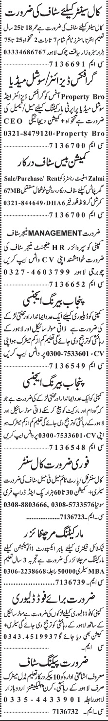 Vacant posts including packing staff, graphic designer, female staff, male staff, call center staff, delivery staff, hr management manager and manager are announced in Private Company Lahore, lahore Punjab Pakistan as per 29 August 2023 advertisement in daily Jang Newspaper. Preferred Education is Bachelor, Primary, Middle, Intermediate and Matric etc.