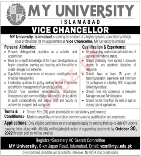 Vacant posts including vice chancellor are announced in MY University Islamabad, islamabad Islamabad Pakistan as per 25 September 2022 advertisement in daily Jang Newspaper. Preferred Education is Bachelor, MS and Master etc.