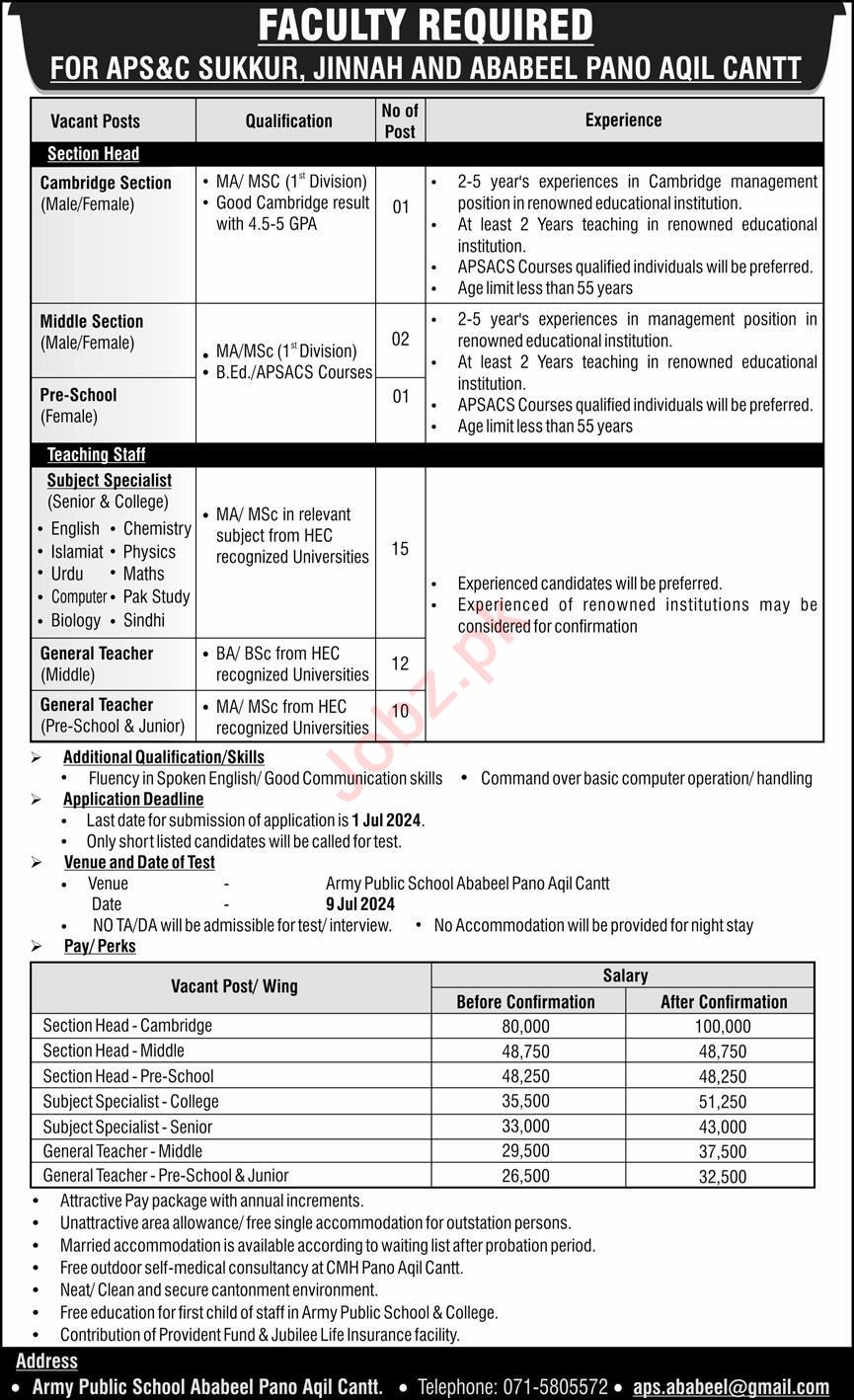 Army Public School & College APS&C Sukkur, sukkur and pano aqil Sindh Pakistan invites applications from eligible candidates for the post of sindhi teacher, pak study teacher, maths teacher, section head pre school, physics teacher, section head cambridge section, urdu teacher, islamiat teacher, english teacher, section head middle section, biology teacher, chemistry teacher, general teacher and computer teacher as per advertisement of June 16, 2024 published in daily Express Newspaper. Candidates with BA, M.sc, MA and B.ed etc. educational background will be preferred.