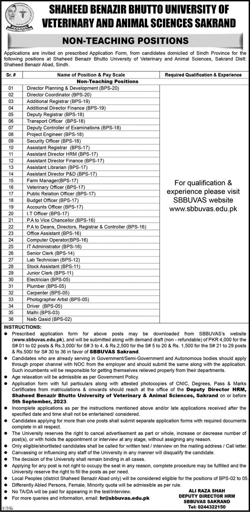 Shaheed Benazir Bhutto University of Veterinary and Animal Sciences Sakrand, sakrand Sindh Pakistan invites applications from eligible candidates for the post of Carpenter, Assistant Director Finance, Transport Officer, Pa To Registrar, Stock Assistant, Deputy Controller Of Examination, Office Assistant, Assistant Director Hrm, Veterinary Officer, Assistant Librarian, Deputy Registrar, Assistant Director Pd, Pa To Controller, Computer Operator, Electrician, Director Coordinator, Plumber, Driver, Photographer Artist, Lab Technician, Pa To Director, Pa To Vice Chancellor, It Administrator, Malhi, Project Engineer, Naib Qasid, Budget Officer, It Officer, Security Officer, Clerk, Additional Registrar, Assistant Registrar, Accounts Officer, Director Planning Development, Farm Manager, Public Relation Officer, Additional Director Finance and Pa To Dean as per advertisement of August 10, 2023 published in daily Kawish Newspaper. Preferred Education is Intermediate, Bachelor, Others, Matric, Master and Middle etc.