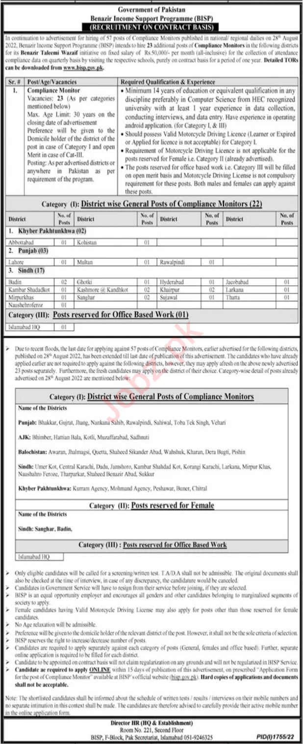 Vacant posts including compliance monitor are announced in Benazir Income Support Programme BISP Islamabad, ghotki, naushahro feroze, kandhkot, rawalpindi, kashmore, jacobabad, abbottabad, thatta, islamabad, qambar shahdadkot, larkana, kohistan, sanghar, sujawal, khairpur, multan, mirpur khas, lahore, hyderabad and badin Islamabad Pakistan as per 18 September 2022 advertisement in daily Jang Newspaper. Preferred Education is Bachelor etc.