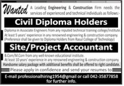 Engineering & Construction Firm Lahore, lahore Punjab Pakistan invites applications from eligible candidates for the post of civil diploma holder, site accountant and project accountant as per advertisement of October 20, 2023 published in daily Jang Newspaper. Educational qualifications required B.com, DAE and M.com etc.