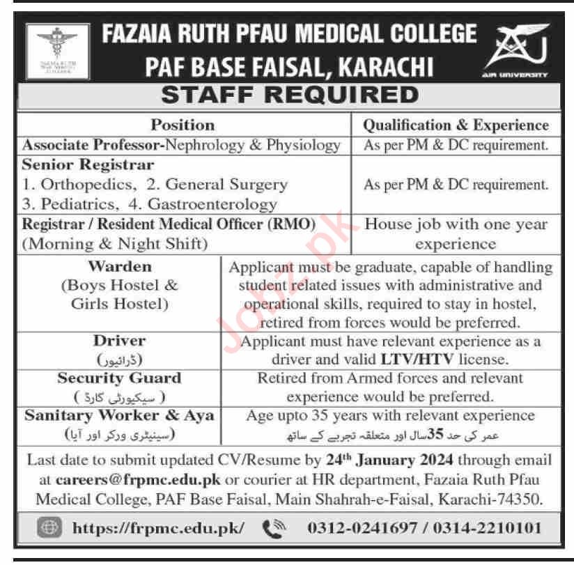 Fazaia Ruth PFAU Medical College invites applications for job positions advertised in daily Dawn dated 14 January 2024 for following vacancies in Karachi, karachi Sindh Pakistan.
