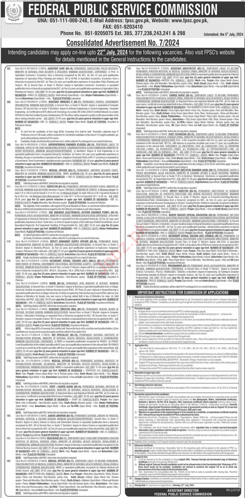 Federal Public Service Commission FPSC invites applications for job positions advertised in daily The News dated 7 July 2024 for following vacancies in Islamabad, islamabad Islamabad Pakistan.