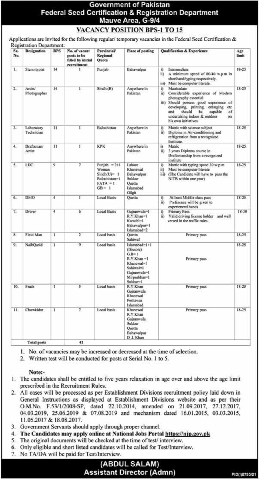 Vacant posts including ldc, draftsman, laboratory technician, dmo, naib qasid, field man, frash, photographer, artist, chowkidar, driver and steno typist are announced in Federal Seed Certification & Registration Department FSC&RD Islamabad, mirpur khas, rahim yar khan, gilgit, lahore, sahiwal, gujranwala, karachi, bahawalpur, sukkur, quetta, islamabad, khanewal and dera bugti Islamabad Pakistan as per 15 June 2022 advertisement in daily Dunya Newspaper. Educational qualifications required Matric, Middle, Others, Intermediate and Primary etc.