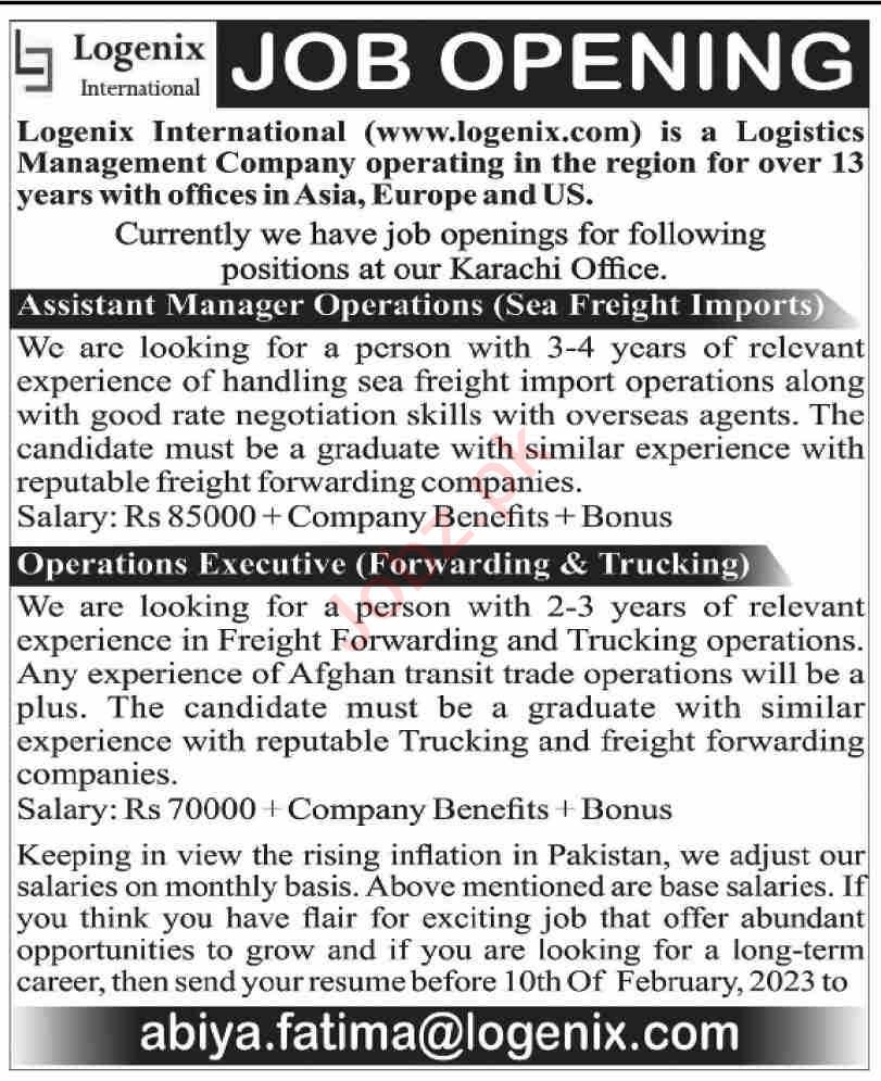Logenix International Pvt Ltd is looking for candidates for following posts as per job advertisement published in daily Dawn Newspaper of February 6, 2023 for location Karachi, karachi Sindh Pakistan: