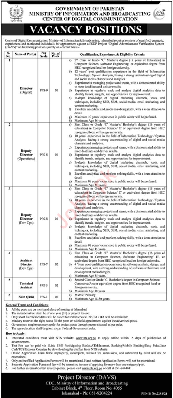 Ministry of Information and Broadcasting invites applications for job positions advertised in daily Dunya dated 29 September 2024 for following vacancies in Islamabad, islamabad Islamabad Pakistan.