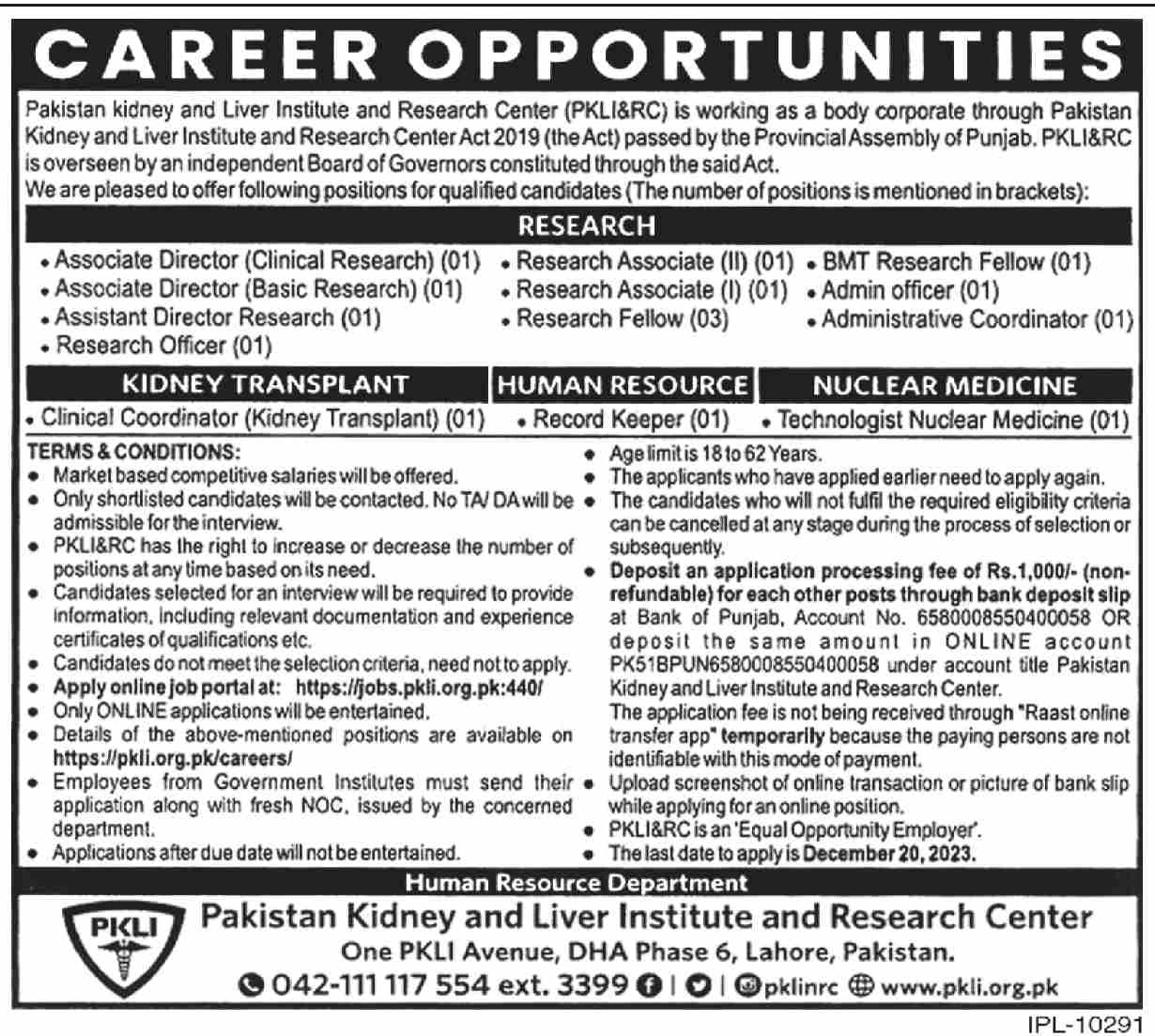 Pakistan Kidney And Liver Institute And Research Centre PKLI jobs advertisement dated about 5 December 2023 in daily Dawn Newspaper invites application for the vacant post of Technologist Nuclear Medicine, Bmt Research Fellow, Assistant Director Research, Administrative Coordinator, Research Fellow, Associate Director Clinical Research, Admin Officer, Clinical Coordinator Kidney Transplant, Record Keeper, Research Officer, Associate Director Basic Research and Research Associate in Lahore, lahore Punjab Pakistan. Others, Master and Bachelor etc. educational qualification will be preferred.