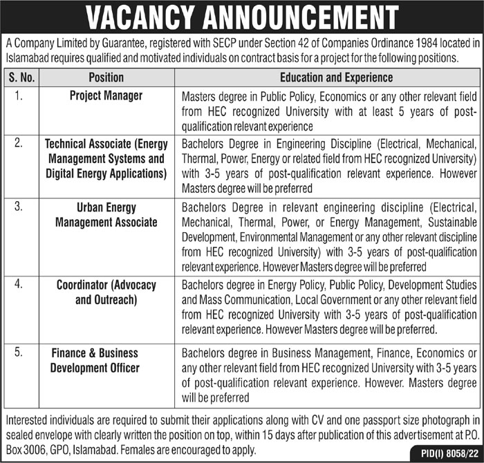 Public Sector Company Islamabad, islamabad Islamabad Pakistan invites applications from eligible candidates for the post of finance business development officer, urban energy management associate, project manager, coordinator advocay outreach and technical associate as per advertisement of June 28, 2023 published in daily Roznama 92 News Newspaper. Candidates with Bachelor and Master etc. educational background will be preferred.