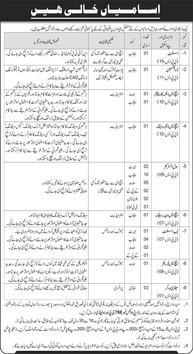 Public Sector Organization jobs advertisement dated about 21 May 2024 in daily Nawaiwaqt Newspaper invites application for the vacant post of hsm welder, hs one welder, civil instructor, hsm carpenter, assistant, hs two fitter, lab assistant, draftsman and sanitary worker in Rawalpindi, rawalpindi Punjab Pakistan. Candidates with Primary, Intermediate, Bachelor and Matric etc. educational background will be preferred.