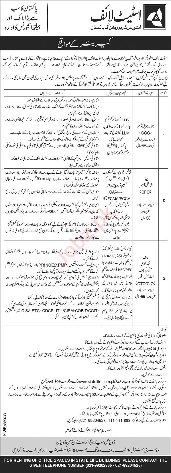 State Life Insurance Corporation of Pakistan jobs advertisement dated about 26 May 2024 in daily Nawaiwaqt Newspaper invites application for the vacant post of chief technology officer, chief financial officer, chief general counselor and chief information officer in Karachi, karachi Sindh Pakistan. Educational qualifications required LLb, Master, LLM and Bachelor etc.