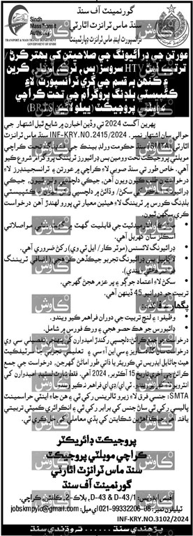 Vacant posts including women bus driver are announced in Transport & Mass Transit Department Karachi, karachi Sindh Pakistan as per 2 October 2024 advertisement in daily Kawish Newspaper. Persons with Intermediate and Matric etc. education can apply.