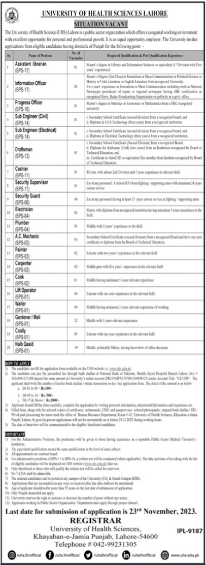 University of Health Sciences Lahore, lahore Punjab Pakistan invites applications from eligible candidates for the post of cook, information officer, carpenter, plumber, electrician, painter, lift operator, ac mechanic, security guard, gardner, sub engineer electrical, draftsman, waiter, mali, cashier, security supervisor, naib qasid, cooly, sub engineer civil, assistant librarian and progress officer as per advertisement of November 3, 2023 published in daily Jang Newspaper. Educational qualifications required DAE, B.com, Master, MS, Primary, Middle and Matric etc.